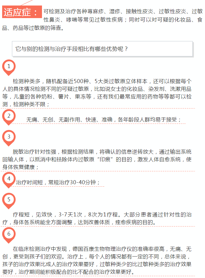 該設備檢測過敏原無痛無創不抽血,檢測時間短(約20分鐘左右),檢測過敏原種類多達500多種,準确率高,同樣适用老人、小孩及特殊體質患者,擴大了檢測患者群體。該設備還具有脫敏治療的功能,脫敏治療時無痛無創不服藥,無副作用及依賴性,治療療程短,治愈率高,提升過敏性疾病患者的生活質量。